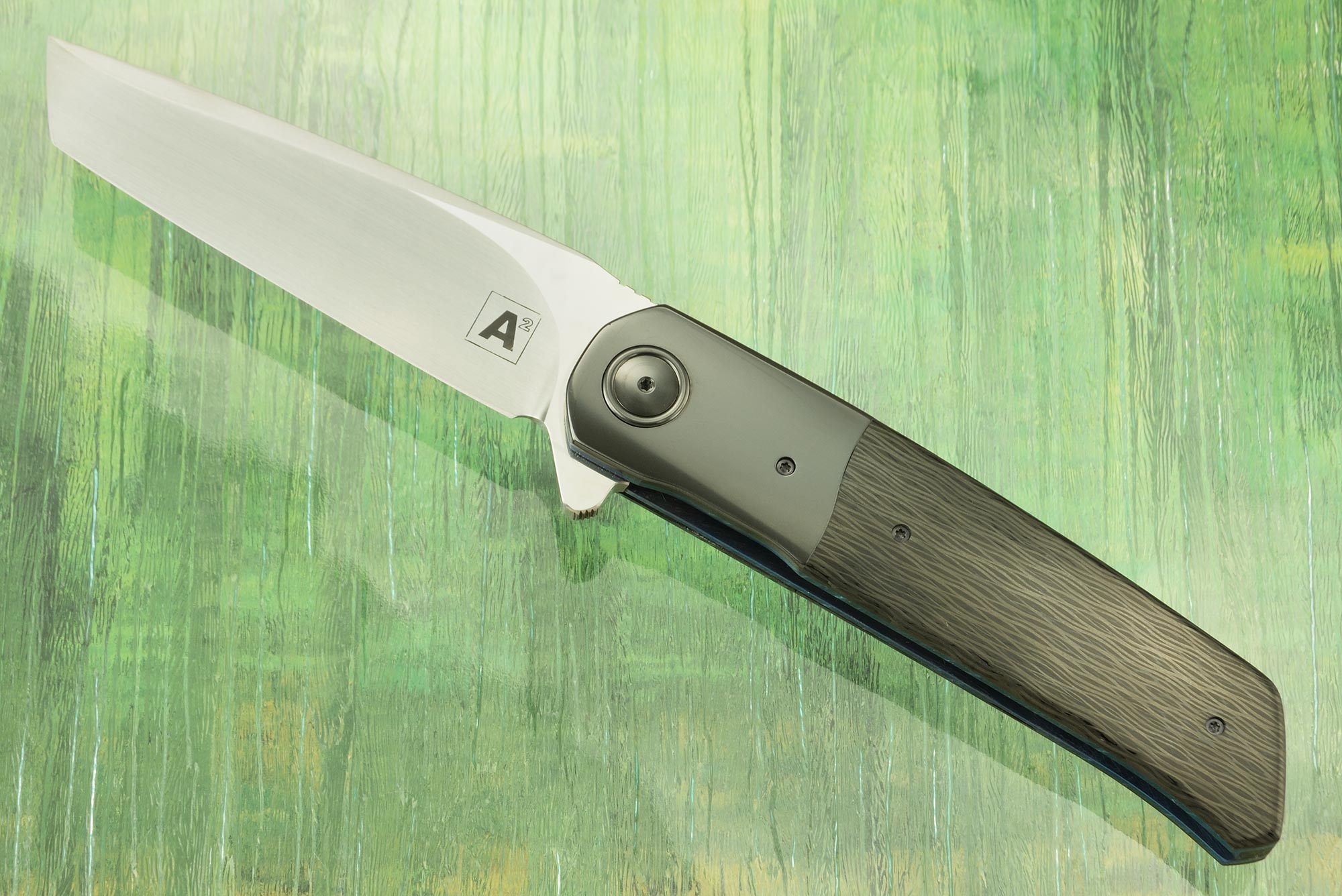 The scales are formed from blackwood carbon fiber, fit perfectly to heat colored zirconium bolsters. Jimping on the thumb ramp aids grip. The gently rounded handle feels sturdy and fills your hand perfectly. Blue anodized titanium liners surround a carbon fiber backbar. Zirconium pivot collars surround the custom zirconium pivot. The 3D machined zirconium pocket clip is mounted for right-side, tip-up carry.