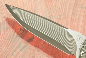 The blade is hand ground from stainless damascus san mai. A central bar of Takefu SG2 powdered metallurgical stainless steel is surrounded by alternating layers of stainless steel and nickel. At Hrc 63-64, this folder has among the best edge holding of any Thorburn knife ever made. The resulting damascus is high contrast and immediately captivating. The linear damascus reveals Andre's complex, super-clean grind. The flats are mirror polished, nearly hiding the pattern. The blade is hollow ground for an easy to maintain edge.