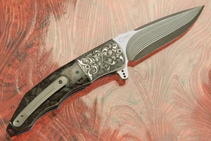 Zirconium bolsters are meticulously hand engraved in floral scroll style. Fine silver inlays provide elegant accents. Engraving and inlay was done by Julien Marchal. Belgium-born artist Marchal studied engraving and gun making at Léon Mignon Liège in Belgium and now lives in South Africa. Titanium liners are anodized blue. The black G-10 backspacer keeps the knife light and fast, extending beyond the end of the handle for an integral lanyard loop. The 3D machined titanium pocket clip with ceramic retention ball is mounted for right-side, tip-up carry.