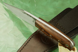 The handle is formed presentation grade Arizona desert ironwood set to a full distal tapered tang. Desert ironwood (Olneya tesota) is a rare wood that is only found in the valleys of the Sonoran Desert below 2,500 foot elevation. It is among the most desirable of exotic woods used for knives. This dense wood is both dramatic and has tremendous stability. A central mosaic pin adds a bit of decoration. The handle is contoured to provide a comfortable and secure grip. If extra retention is desired, a lanyard can be added using the included lined lanyard hole.