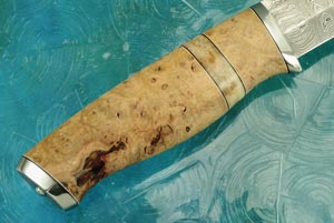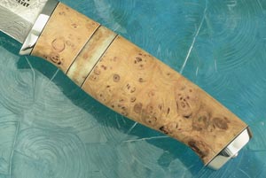 The handle is formed from stabilized white pear (Apodytes dimidiata) seperated by a central stabilized bone spacer. The handle is contoured to swell at the center to fill out the hand nicely and narrows at the front and back of the handle to provide excellent grip. Thin black and white fiber spacers assist the handle adjust to humidity and temperature changes. The handle is finished with a 303 stainless steel front and rear guard.