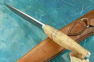 A brown leather sheath made by Kevin is included. The core of this traditional Scandinavian style sheath is formed from beechwood. A "swinger" style belt loop allows the sheath to move out of the way when sitting down.