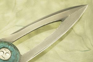 The pierced leaf blade is hand ground from VG-10 stainless san mai damascus. A central core of VG-10 stainless steel is surrounded by many layers of alternating linear damascus. It features a high performance convex grind.