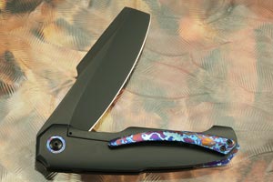 The 6Al-4V titanium handle features a blacked out Cerakote finish. A sturdy framelock provides a strong lockup. Night Fire rag Micarta is inlaid into the left scale. The backbar, pivot collar, and pocket clip are all made from Timascus titanium damascus. The pocket clip is mounted for right-side, tip-up carry.