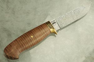 Engraved Damascus Drop Point Hunter (Model LR) with Curly Maple