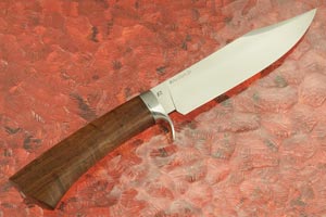 The handle is formed from ringed gidgee wood (Acacia cambagei). Gidgee is an exceptional wood for knife handles and is considered to be one of Australia's most beautiful timbers. It has tremendous stability even when exposed to fluctuations in humidity and temperature. It is among the densest woods in the world and has a beautiful curl similar to Hawaiian koa. The handle is heirloom fit to a wrought iron guard. The sides of the wrought iron are satin finished, revealing just a little bit of the wrought iron's natural texture. The front face of the guard shows the texture inherent to the antique wrought iron. The handle is exceptionally comfortable and well balanced. As is typical of Mike Clark's work, this knife features take-down construction. This technique, which requires exceptional attention to detail, allows the knife to be disassebled if it ever needs repair.