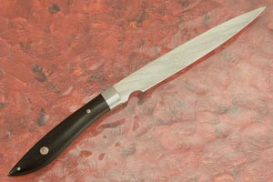 The ATS-34 stainless steel blade was etched with a relief for his maker's mark. This results in a "damascene" pattern that has made his work well known. The stainless steel blade will have exceptional edge holding. The 6 inch, slender blade makes it very useful and versatile in the kitchen, from slicing fruit to chopping garlic, to removing silverskin from meat.