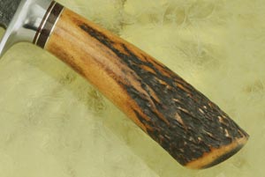 The handle is formed from a downturned section of stag. Alternating spacers formed from Micarta and stainless steel separate the stag from the polished 420 stainless steel guard. The handle is exceptionally comfortable and the natural texture of the stag provides plenty of grip.
