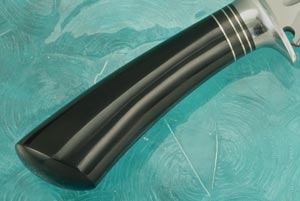 The handle is formed from a downturned section of jet black buffalo horn. Alternating spacers formed from carbon fiber and stainless steel separate the buffalo horn from the polished 420 stainless steel guard. The handle is exceptionally comfortable and well balanced.