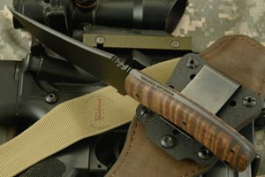 This knife is very similar to the standard issue model Daniel Winkler is currently providing to active duty operators within the Naval Special Warfare Unit. The blade is formed from 3/16" 80CrV2 carbon steel with a non-glare Caswell black oxide finish. A stained maple handle is set on the full tang. A tapered full tang means great balance.