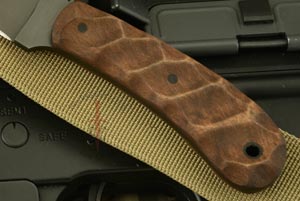 A stained curly maple handle is set on the full tang and secured using two pins. The scales have been gently rounded to fill the hand nicely.