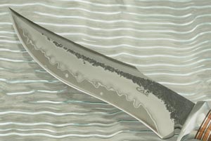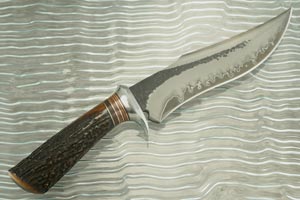 The blade was hand forged from 1095 carbon steel surrounded by 420 stainless steel. This technique, known as san mai (three layers) provides the performance of 1095 carbon steel with the lower care offered by stainless steel sides. The transition between the hard center core and the softer sides is particularly dramatic, with a transition line similar to a hamon in appearance. The flats are forge textured to show its history of being forged closely to shape.