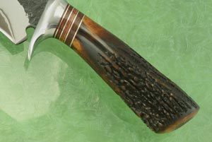 The handle is formed from a downturned section of stag. Alternating spacers formed from Micarta and stainless steel separate the stag from the polished 420 stainless steel guard. The handle is exceptionally comfortable and the natural texture of the stag provides a perfect grip.