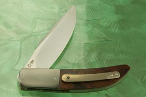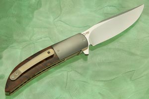 Handle scales are formed from Arizona desert ironwood (Olneya tesota). Ironwood is one of the most desirable woods used in knifemaking. The scales are heirloom fit perfectly to heat colored zirconium bolsters. Zirconium is a transitional metal that is primarily mined in South Africa and Australia. It is resistant to corrosion and scuffing. Bronze anodized liners surround an M390 stainless steel backbar. The 3D titanium pocket clip is mounted for right-side, tip-up carry.
