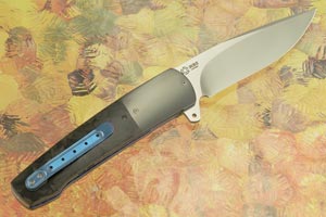 Shred carbon fiber handle scales are set on anodized titanium liners, providing an elegant contrast. The scales meet perfectly to polished, heat colored zirconium bolsters. Zirconium is a transitional metal that is primarily mined in South Africa and Australia. It is resistant to corrosion and scuffing. The handle is completed with an anodized titanium pocket clip mounted for right-side, tip-up carry.