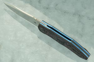Handle scales are formed from Purple Haze FatCarbon. Jimping on the thumb ramp aids grip. The gently rounded handle feels sturdy and fills the hand perfectly. The custom pivot and collar are made from heat colored zirconium. The handle is completed with blue anodized titanium liners surrounding a carbon fiber backspacer. The ultra-light titanium pocket clip is mounted for tip-up, right-side carry.
