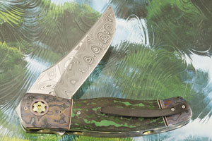 Jungle Wear FatCarbon handle scales meet perfectly with front and rear Black Timascus bolsters. Dovetailing the seams ensures a perfect fit. The anodized titanium pivot is surrounded by a titanium pivot collar. Titanium liners are anodized and surround a damascus backbar. The stainless damascus pocket clip is mounted for right-side, tip-up carry.