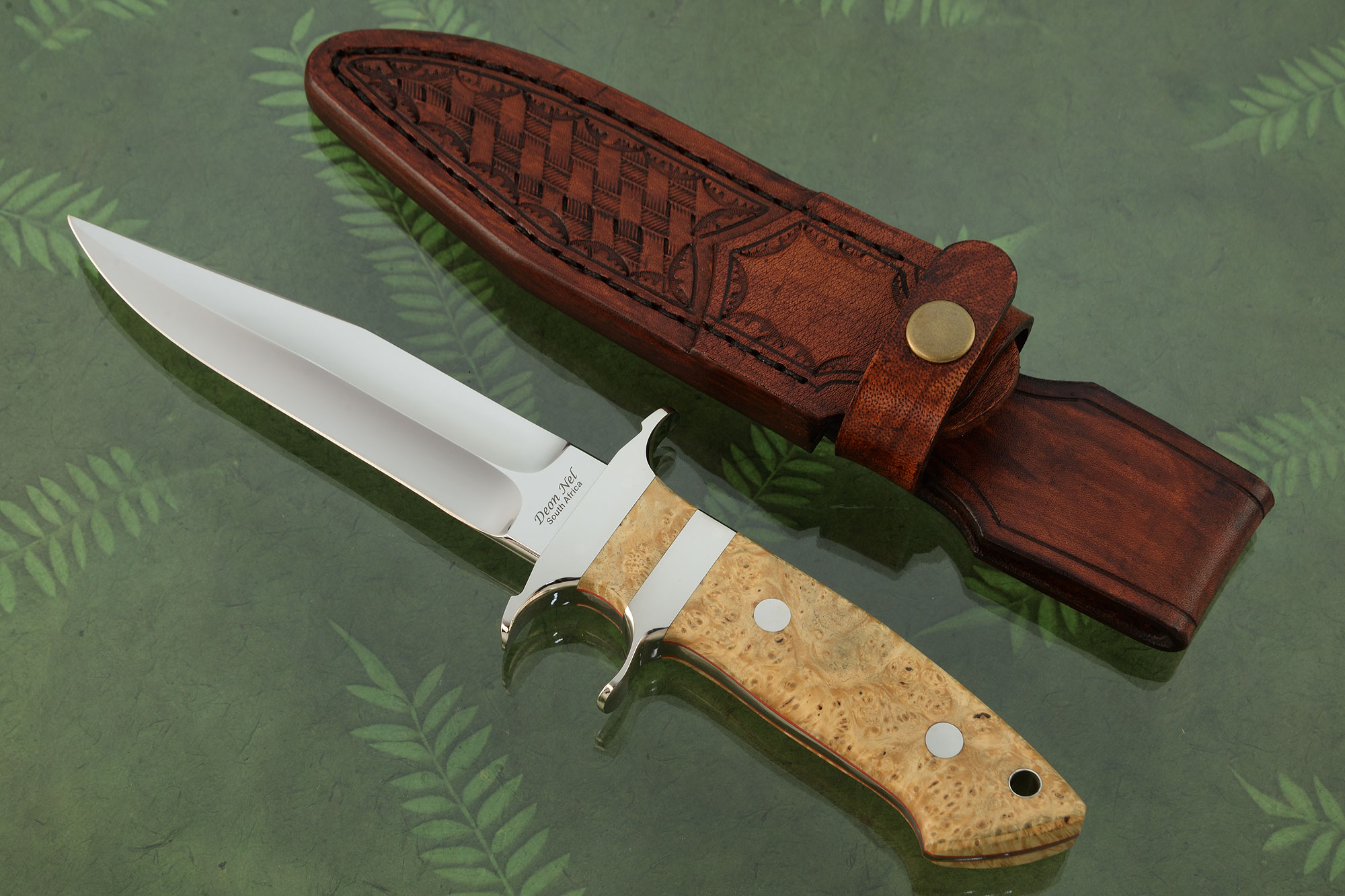 Presentation grade birdseye maple handle scales are set on the distal tapered full tang for strength and durability. Vulcanized fiber spacers add a nice contrast. The handle is perfectly contoured for a secure, comfortable grip that you won't want to put down. It is completed with two Corby bolts and a steel lined lanyard hole. The 303 stainless steel guards meet perfectly to the natural maple handle scales.