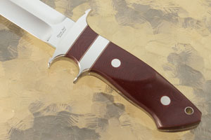 Maroon Micarta scales are set on the distal tapered full tang for strength and durability. Vulcanized fiber spacers add a nice contrast. The handle is perfectly contoured for a secure, comfortable grip that you won't want to put down. It is completed with two Corby bolts and a steel lined lanyard hole. The 303 stainless steel guards meet perfectly to the Micarta handle scales.