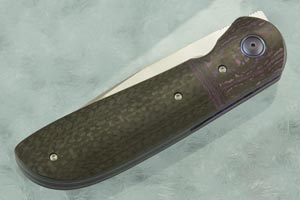 The handle combines black carbon fiber scales with Purple Haze FatCarbon bolsters. Blurple anodized titanium liners surround a carbon fiber back spacer. The custom titanium pivot and pivot ring are anodized to match. An anodized, orange peel textured titanium pocket clip is mounted for right-side, tip-up carry.