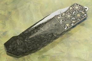 Shred carbon fiber scales have been nicely domed and polished. Jimping on the thumb ramp provides a comfortable, secure grip. The gently rounded handle feels sturdy and fills your hand perfectly. Zirconium bolsters are meticulously engraved and inlaid with fine silver and 24k gold accents by Julien Marchal. Belgium-born artist Julien Marchal studied engraving and gun making at Léon Mignon Liège in Belgium and now lives in South Africa. The European floral scroll engraving shows his tremendous attention to detail and elegant designs. The handle is completed with anodized fileworked titanium liners that surround the stainless damascus backbar. The 3D machined titanium pocket clip with ceramic retention ball is mounted for right-side, tip-up carry. Both the pocket clip and the screws feature a TiAlN finish.
