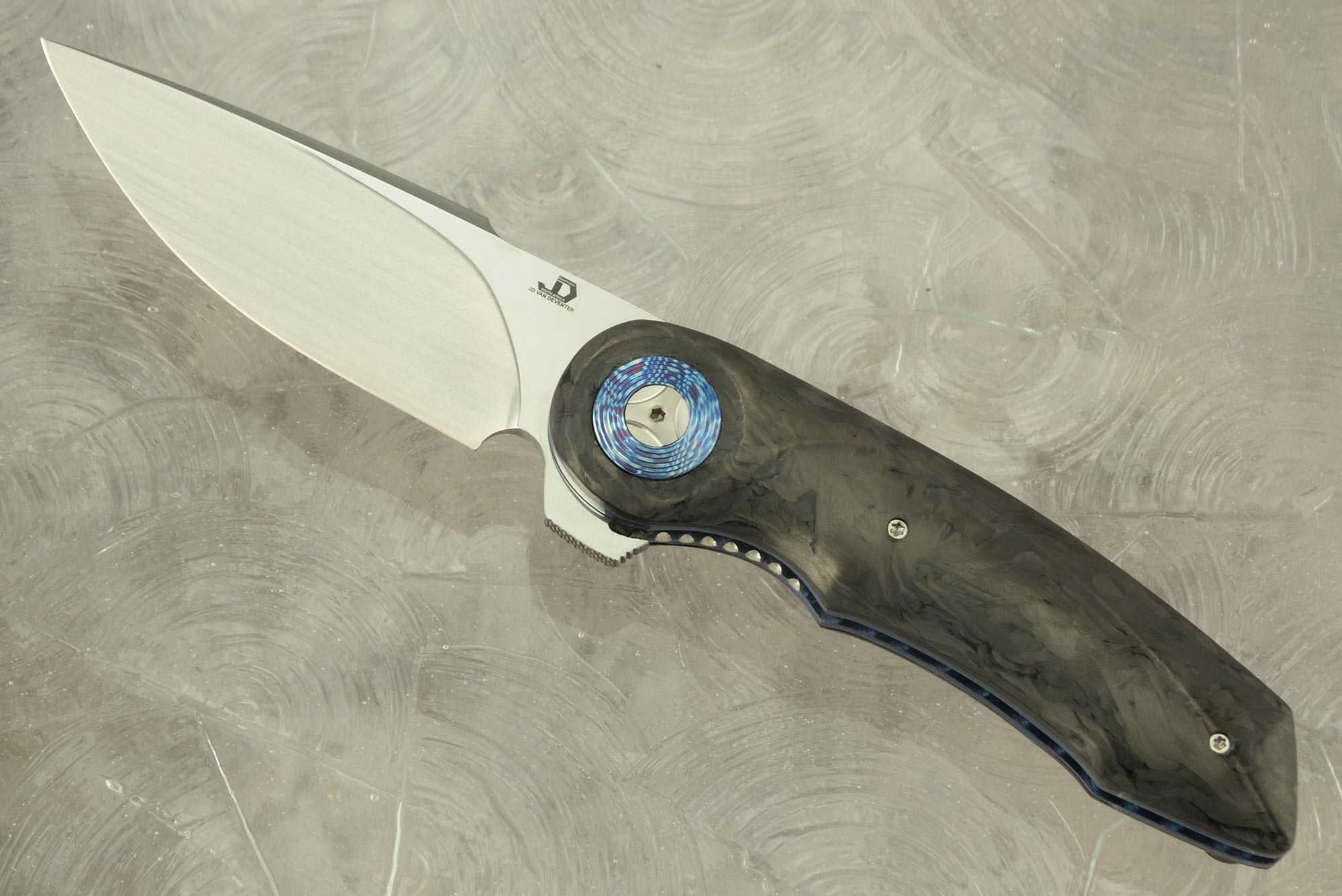 The scales are 3D machined marble carbon fiber. A terraced Timascus titanium damascus pivot ring adds flash. Anodized titanium liners surround a carbon fiber back spacer. The black titanium pocket clip is mounted for right-side, tip-up carry.