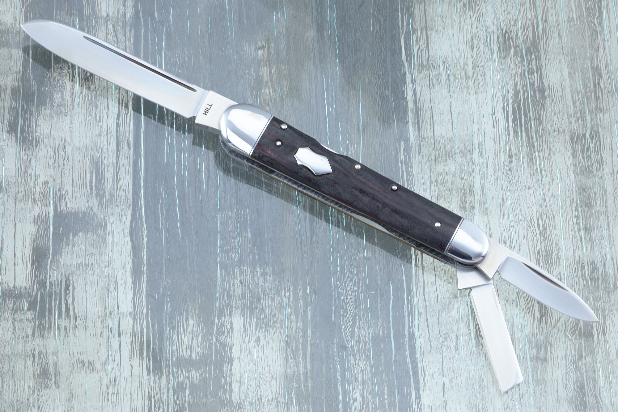 Description: This Three Blade Lockback Whittler by Tobin Hill is a spectacular knife. The sheepsfoot and a spearpoint blades are set up with a slipjoint mechanism. The primary blade uses a backlock mechanism. It is an amazing folder. Tobin learned to make knives from legendary folder maker Bill Ruple. He is clearly a maker to watch. This knife was kept in a private collection since it was made in 2021. It is in brand new condition and by all appearances, it could have been made yesterday!