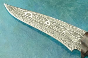 The multi-bar composite mosaic damascus blade has excellent contrast and very complex patterns. It show's Conny's skill at its best. The central bar of mosaic damascus is forged using carbon steels and pure nickel, creating particularly high contrast. The firecracker pattern edge bar is forged from Uddeholm 15N20 and 20C carbon steels, ensuring the best possible edge.
