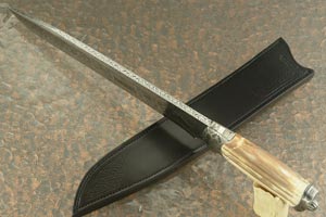 The dramatic handle is ancient walrus ivory. It is hand carved and shows exceptional beauty. The guard and pommel are matching mosaic damascus.