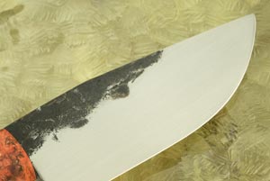 The contoured, ergonomic handle is box elder burl. It has been stabilized and double dyed, bringing out the tremendous beauty in this wood. It is set on a distal tapered full tang for strength and durability using nickel silver pins and a lanyard tube. The handle is beautifully shaped for a secure comfortable grip.