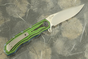 Handle scales are formed from green/black carbon fiber. Jimping on the thumb ramp aids grip. The flipper doubles as a front guard that keeps your hand from sliding forward onto the blade. The gently rounded handle feels sturdy and fills out the hand perfectly. A black zirconium pivot collar surrounds the TiAln coated custom titanium pivot. The handle is completed with anodized and fileworked titanium liners that elegantly contrast against the scales and carbon fiber backspacer. The 3D machined titanium pocket clip is mounted for right-side, tip-up carry and features a ceramic ball for excellent pocket retention.