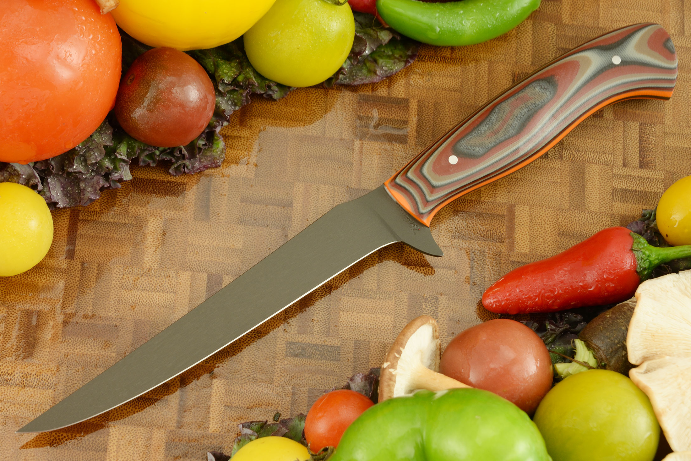 This high performance bird & trout is sure to become a 'goto' knife -- both in the kitchen and when out fishing and hunting. This beautiful knife is the right tool for two key tasks — boning and filleting. When boning, the narrow, sharp blade gets in close to the bone, making it easy to separate meat from bone. The extremely sharp edge even cuts through fibrous material with ease. It’s perfect for trimming the silverskin from a tenderloin or even making your own cutlets. The narrow blade reduces drag as you cut against the meat, so cutting is fast and easy. When it comes to filleting fish, the blade's 5-3/4 inch length is just right to glide through the body of the fish, quickly removing bones and skin. The stiff knife makes it easy to keep track of the tip even when slicing through meats.