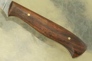 The handle is formed from cocobolo wood (Dalbergia retusa) secured to the full tang using two brass pins. Warm toned cocobolo is a highly resinous wood that holds up beautifully to the demands of either a home or commercial kitchen. The domed scales are extremely comfortable and are carved to accomadate a pinch grip. Like other knives, this knife should not be put in the dishwasher.