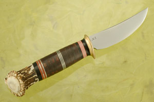This hunter is very true to Scagel's design -- from the carbon steel upswept blade to the crown stag handle with stacked leather spacers. Doug chose to follow the color themes used by Scagel, combining leather with bronze, steel, and fiber spacers. The resulting handle is both dramatic and extremely comfortable. The front of the bronze guard is beveled and fits perfectly to the carbon steel blade. The blade has been meticulously hand satin finished.