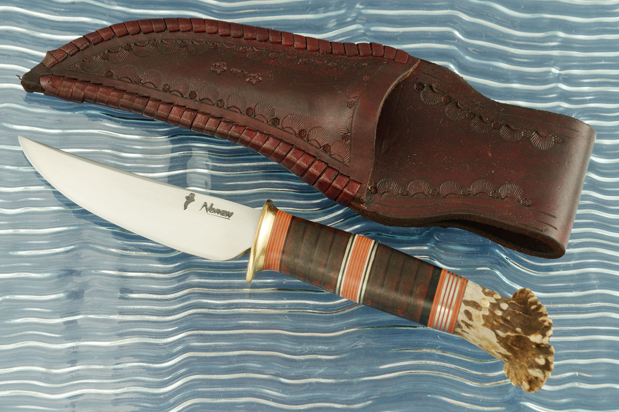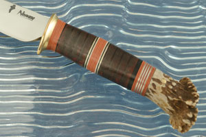 This hunter is very true to Scagel's design -- from the carbon steel upswept blade to the crown stag handle with stacked leather spacers. Doug chose to follow the color themes used by Scagel, combining leather with bronze, steel, and fiber spacers. The resulting handle is both dramatic and extremely comfortable. The front of the bronze guard is beveled and fits perfectly to the carbon steel blade. The blade has been meticulously hand satin finished.