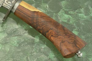 The handle is made from presentation grade Arizona desert ironwood. This rare piece includes heartwood and sapwood into a truly dramatic and elegant handle. It is nicely hand contoured and set to the wrought iron ferrule and guard with an heirloom fit. This knife has great balance and feels exceptional in hand. As is typical of Mike Clark's work, this knife features take-down construction. This technique, which requires exceptional attention to detail, allows the knife to be disassembled if it ever needs repair.