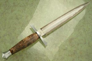 The handle combines a central column of stabilized spalted maple with a wrought iron guard and steel pommel. A heat blued steel spacer finished the handle. An heirloom fit between the spalted maple and fittings ensures a timeless, perfect fit. The handle feels exceptional in the hand and is perfectly balanced.