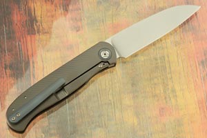 The handle is made from textured Grade 5 titanium and features a handsome bead blast finish. The front scale is made from textured Copper Dark Matter FatCarbon and keeps the knife under 3 oz! Trevor's maker mark (TBC) is engraved into the lockside of the handle. The titanium backbar, pivot collar, and pocket clip are all anodized. The pocket clip is mounted for right-side, tip-up carry.