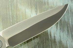 The blade runs on caged ceramic ball bearings that Trevor makes in house and has silky-smooth, drop-shut action. It is easily opened single-handed using the discreet front flipper. The blade is perfectly centered. It is hand ground stainless damascus san mai. A central bar of Takefu SG2 powdered metallurgical stainless steel is surrounded by alternating layers of stainless steel and nickel. The resulting damascus is high contrast and immediately captivating. The flats are mirror polished, nearly hiding the pattern. The blade is hollow ground for an easy to maintain edge. This blade will have some of the greatest edge retention of any Trevor Burger made!