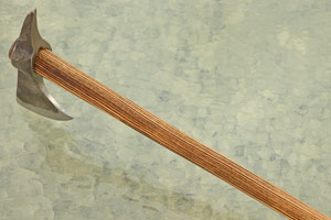 The haft is hand carved ash, finished with boiled linseed oil. The ash nicely complements the forge textured blade giving the tomahawk an old world feel. The haft is tapered to provide excellent balance for throwing and chopping.