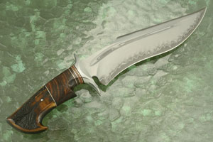 The handle is contoured from Arizona desert ironwood and stag, secured using a hand domed pin. Alternating spacers formed from Micarta and stainless steel surround the central ironwood column. This is among the most comfortable handles you will ever feel. It is fit perfectly to a 420 stainless steel guard. The knife has exceptional balance and feels great in the hand.