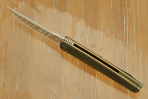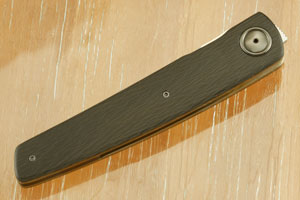 Handle scales are formed from blackwood carbon fiber. Jimping on the thumb ramp aids grip. The gently rounded handle feels sturdy and fills the hand perfectly. The heat colored zirconium custom pivot is surrounded by a zirconium pivot collar. The handle is completed with anodized titanium liners that surround a carbon fiber backspacer. The ultra-light titanium pocket clip is mounted for tip-up, right-side carry.