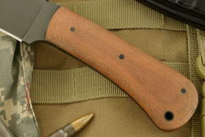 Tan micarta handle scales are set on the distal tapered full tang. They are nicely rounded for a secure, comfortable grip.