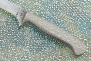 The handle is formed from silver twill secured to the full tang using two brass pins. The bright handle ensures it will always be easy to find, even in dark conditions. The domed scales are extremely comfortable and are carved to accomadate a pinch grip. Like other knives, this knife should not be put in the dishwasher.