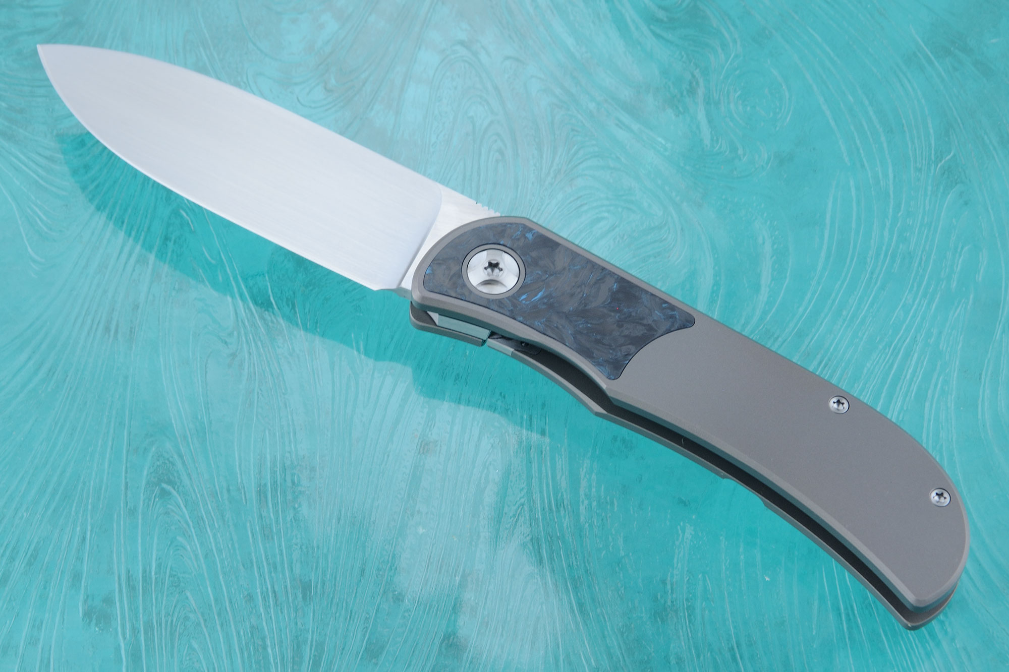 The handle is made from bead blasted grade 5 titanium and features a Blue Dark Matter FatCarbon inlay on the left side. Trevor's maker mark is engraved on the inside of the handle. The backbar, pivot collar, and pocket clip are all made from titanium. The pocket clip is mounted for right-side, tip-up carry.