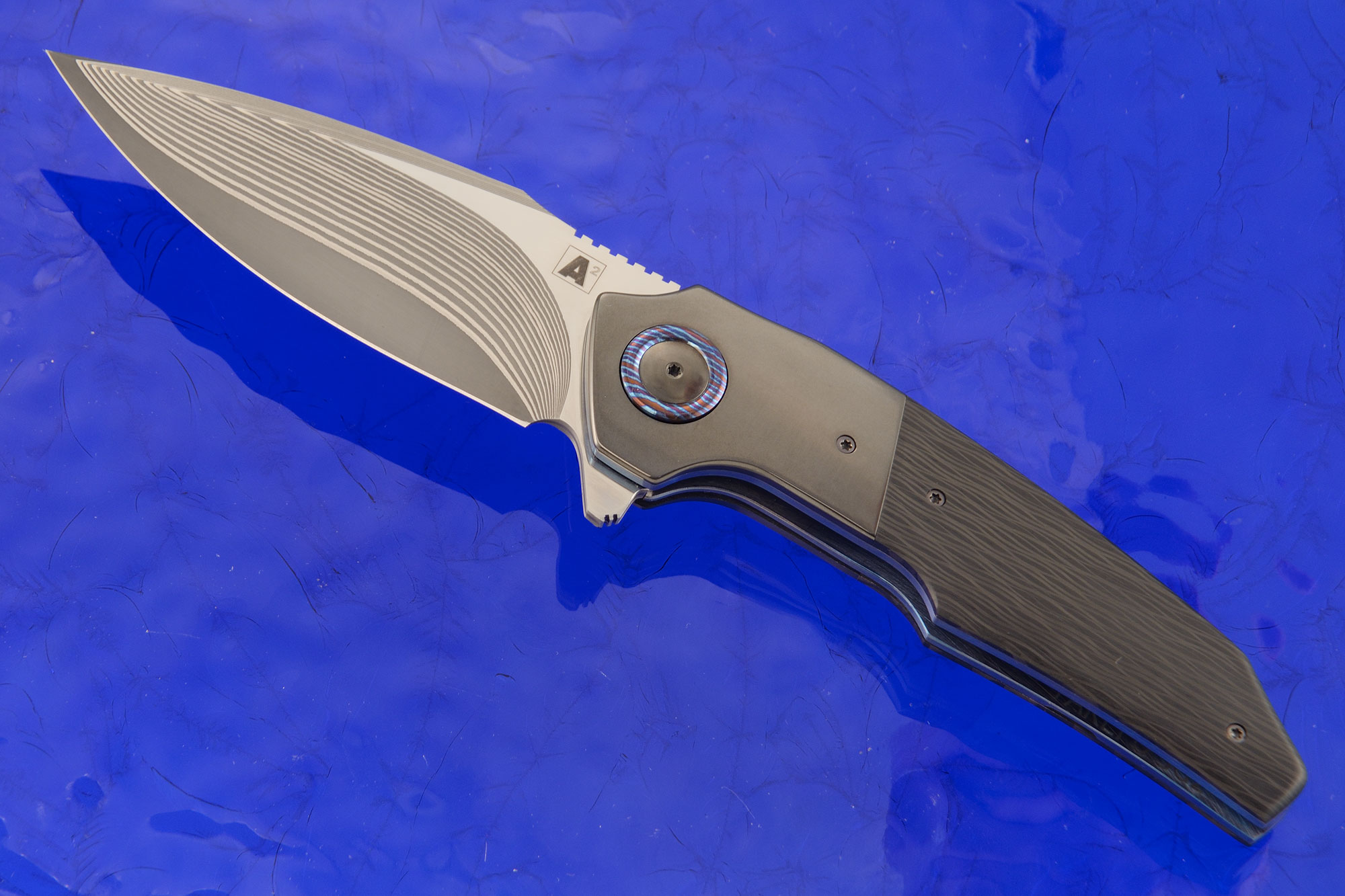 Handle scales are blackwood carbon fiber, fit perfectly to heat colored zirconium bolsters. Zirconium is a transitional metal that is primarily mined in South Africa and Australia. It is resistant to corrosion and scuffing. A Timascus titanium damascus pivot collar surrounds the custom zirconium pivot. Blue anodized titanium liners surround a carbon fiber backbar. The zirconium pocket clip is mounted for right-side, tip-up carry.