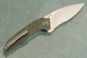 Handle scales are Green Dark Matter FatCarbon. The custom pivot is heat colored zirconium and is surrounded by a matching heat colored zirconium pivot collar. Jimping on the thumb ramp aids grip. The gently rounded handle feels sturdy and fills the hand perfectly. Bronze anodized titanium liners surround a carbon fiber backbar. PROTOTYPE is engraved on the inside of the titanium liners. This is one of three prototypes that were made. The 3D machined zirconium pocket clip is mounted for right-side, tip-up carry.