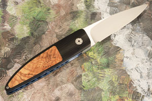 Black G-10 handles scales are inlaid with South African wild olive wood (Olea europeae sub sp. Africana). This medium brown toned wood has tremendous figure. The combination is particularly dramatic. Anodized titanium liners keep the knife strong, yet light. At just 2.2 oz, this knife is easy for everyday carry.