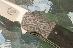 Green Dark Matter FatCarbon handle scales meet seamlessly to mosaic damascus bolsters hand forged by Prinsloo. The influence of Prinsloo's friend, Don Hanson, is clearly visible in the highly detailed damascus bolsters. The 3D machined, anodized titanium pocket clip is mounted for tip-up, right side carry.