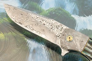 The hollow ground blade is Vinland pattern damascus forged by Damasteel in Sweden. The blade has smooth, drop shut action and is easily opened with one hand using the ambidextrous flipper toggle. It uses the IKBS (Ikoma Korth Bearing System) pivot system. This mechanism, which was originally designed to fit balisong knives, uses ball bearings to create exceptional action with no blade play. This special folder is made with ceramic ball bearings. Generally IKBS bearings are made either from tool steel or from stainless steel. Stainless steel can wear away, resulting in uneven action over time. Tool steel bearings can oxidize making the action rough. Ceramic bearings are the best of all worlds -- extremely hard and wear resistant, they are also inert and will not oxidize.